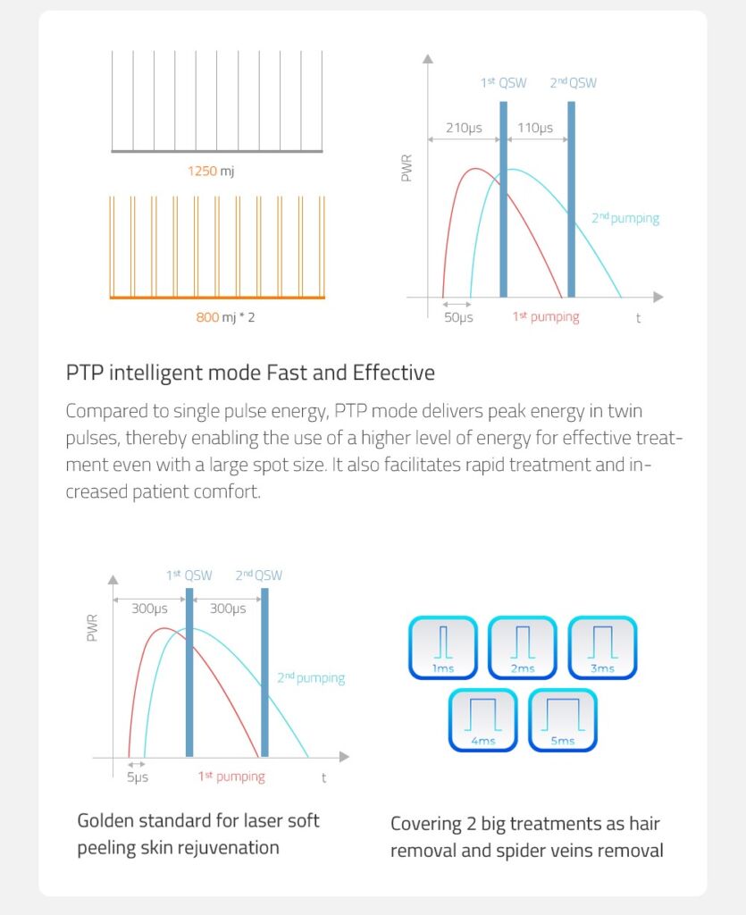 Compared to single pulse energy, PTP mode delivers peak energy in twin pulses, thereby enabling the use of a higher level of energy for effective treatment even with a large sport size. It also facilitates rapid treatment and increased patient comfort.